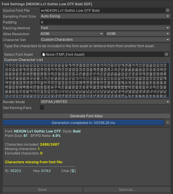 커스텀 캐릭터 리스트는 상용한글 2350자를 직접 넣음 (뛰어쓰기 공백도 포함해주어야한다.)